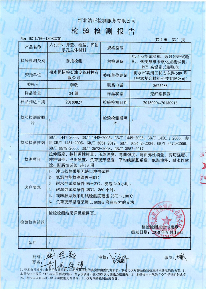 人孔井、井蓋、油盆、卸油手孔井主體材料檢測(cè)報(bào)告